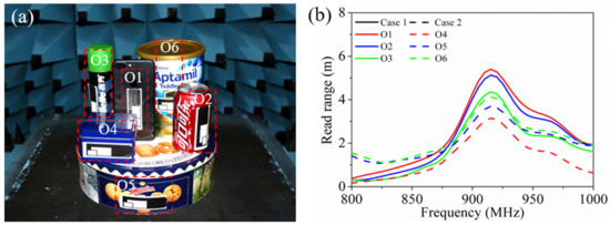 Moreover, considering daily objects, the tags were attached to six different metallic objects (O1–O6, namely, a mobile phone, Coca-Cola container, shaving foam container, tea container, cookie container and milk powder container), as shown in Figure 15a.