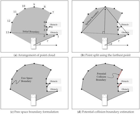Figure 3c). A potential collision may occur between the obstacles (points 3 to 4) and between the obstacle and the maximum range of the sensor (points 6 to 7). For this reason, the cloud points for obstacles (points 1 to 6) are subtracted from the free space boundary, except for the first and the last cloud points of the obstacles. Through the above process, the PCB can be obtained as a set of line segments, as shown by the red lines in
