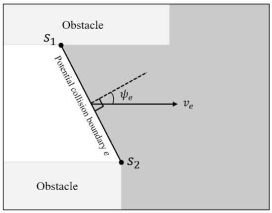 When the surrounding environment is detected by a sensor mounted on an autonomous vehicle, the field of view might be partially occluded by obstacles such as parked vehicles or constructions. In addition, there may be unobservable pedestrians in the parking lot, which have the potential to collide with the ego vehicle. Therefore, a method for considering occluded areas must be formulated for safe driving. The surrounding environment of the ego vehicle is divided to areas according to whether the vehicle can detect when an obstacle exists. The area surrounded by observable obstacles is known as a “free space”. Conversely, areas with obstacles that interfere with detection of obstacles are called “unknown areas”. A collision boundary is the border between the free space and the unknown area. Among the collision boundaries, the boundary where unobservable obstacles may pop out is called the “potential collision boundary (PCB)”. We assume here that the unobservable risk from limited visibility originates from the potential collision boundary. The details for calculating PCB will be explained in the following section.