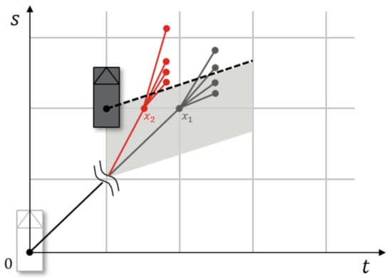Figure 10b–d. The reachable set is transformed into the distance-time domain with the red polygon in the lower figure. Then, the ego vehicle continuously decelerates until the field of view is large enough to eliminate PCBs. Since the parking lot is not enough to secure visibility due to parked vehicles, the ego vehicle maintains a low speed than the regulation during roaming. (see