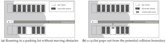Figure 9. The first scenario includes the ego vehicle roaming in a parking lot where parked vehicles exist. From this scenario, the proposed method shows the ability to drive safely in limited visibility. The second scenario includes a cyclist that pops out from the potential collision boundary. Through the second scenario, the safety of the proposed algorithm will be proved.