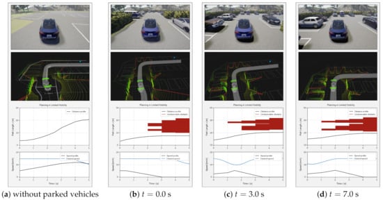 Figure 10b), the ego vehicle moves toward an empty parking space without observable obstacles. The ego vehicle tries to generate a speed profile to keep up the regulation speed. However, the ego vehicle cannot speed up until it reaches the regulation speed because it collides with invisible obstacles when speeding up. At that time, the prediction of unobservable obstacles is realized by reachable set estimation as shown in the red polygon in the lower figure of