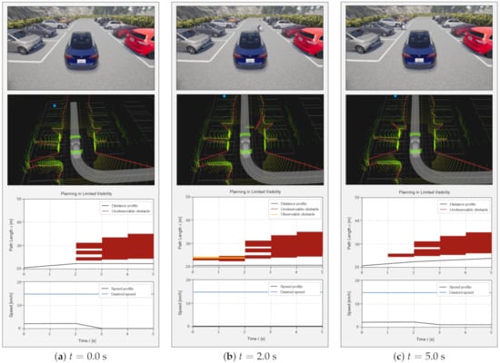 Figure 11c. This simulation results confirm that the reachable set estimation is well defined to consider unobservable obstacles occluded by other traffic participants. Moreover, the cost and heuristic functions of the guided A* algorithm are guaranteed to consider both observable and unobservable obstacles.