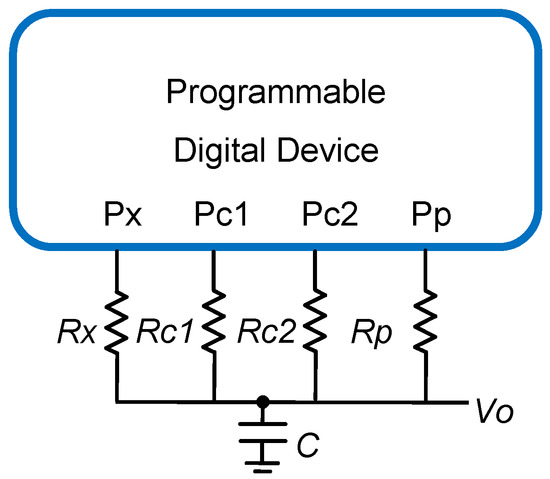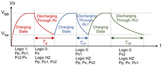 This situation has been labeled as the “Charging State” in Figure 2. The Rp resistor in Figure 1 is added to improve the rejection of the power supply/noise interference [27], and its value should be minimal in order to speed up the charging processes. With Rp, the time measurements from the start of the discharge until Vo(t) = VTH (from now on, named as detection time) will be more independent of these noises. The capacitor is discharged through the different circuit resistors after each charging state by configuring the appropriate pin (Px, Pc1, or Pc2) as a logic 0 output. This procedure allows three times to be generated, corresponding to the discharge through each resistor, Tx, Tc1, and Tc2 in Figure 1. For each capacitor discharge, Vo(t) could change between the voltage for a logic 1, VDD, and the voltage for a logic 0, 0 V. Then