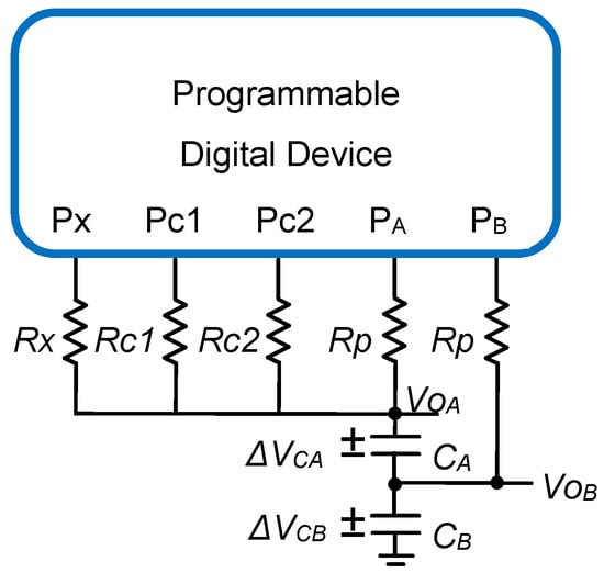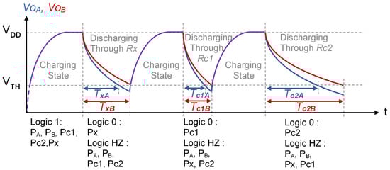 The TCDIC in Figure 3 consists of the same number of charging and discharging stages, as shown in Figure 2 for the classic DIC based on TPCM. The only difference is that two nodes now have to be charged and discharged. In the charging state of TCDIC, the PA and PB pins are configurated as logic 1 outputs, placing the voltage VDD in A and B. This actually performs the full discharge of CA and a charge of CB; however, for clarity, we will continue to call this time interval the charging state. These will be the initial conditions for the discharging states. The other resistors help to establish the voltage VDD in node A during the charging state, configuring pins Px, Pc1, and Pc2 as logic 1 outputs.
