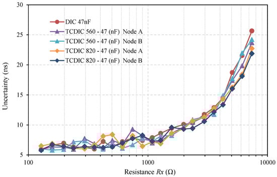 As the criterion for the optimal design is met, Equation (15) indicates that these uncertainties must also be very similar to those obtained through the TCDIC pin PB. This can be seen in Figure 5, which shows the uncertainty curves (expressed in ns) when measuring the discharging times through each of the series resistors, and for the three sets of tests carried out. The curve labeled “DIC 47 nF” shows uncertainty in the discharge time measurement in the DIC in Figure 1, while the rest of the curves show the uncertainties of the time measurements for the different TCDIC configurations.
