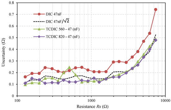 Figure 5 confirms the equality in the time measurements uncertainty, and as the time measurements are very similar, we expected that u(Rx)TCDIC < u(Rx)DIC will be confirmed. This improvement can be seen in Figure 6. This figure shows the uncertainty obtained in estimating Rx (expressed in Ω) from the 500 estimates made for each of the three series of tests. The uncertainty curves of this figure more clearly illustrate the benefits of the TCDIC over the TPCM-based DIC.