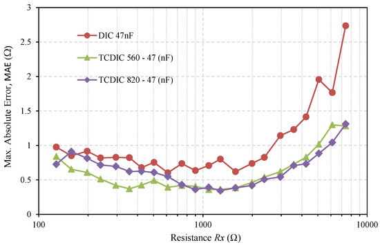 where i indicates the number of the estimate (MAE(Rx) is the “worst” case of the 500 measurements). As expected, Figure 7 shows that higher values of MAE(Rx) occur when estimating higher resistance values. For these resistances, MAE(Rx) is always greater using the DIC in Figure 1 than in any of the TCDIC configurations. The decrease in MAE(Rx) is due not only to the reduction in u(Tx), but also to the reductions in u(Tc1) and u(Tc2). Figure 7 also confirms that, for the lower resistances, the increasing quantization errors and errors due to approximations in Equations (2) and (11) make the situation more confusing. However, the errors in the DIC are greater than in the TCDIC in practically all cases.