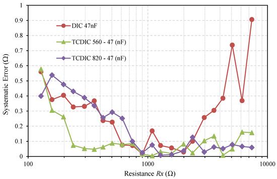 Finally, in Figure 8, we compare the systematic error in estimating Rx through the two interface circuits. This systematic error is defined as the difference between the average of the 500 estimates made for Rx in each test with the actual resistance value. Once again, we see similar behavior to that shown in Figure 6 and Figure 7: the TCDIC has a clearly lower systematic error than the DIC for high resistances. The reduction in these cases was higher than 80% for the configuration with CA = 560 nF and higher than 90% for CA = 820 nF. As expected, the systematic errors for TCDIC and DIC were very similar due to the quantization errors for low resistance measurements.