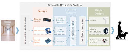Figure 1 shows a simple WND system concept based on computer vision. GPS (Global Positioning System), images, and inertial information are collected and input into a microcomputer controller unit simultaneously. Then, positioning and navigation are performed based on the data of multi-sensor fusion among these sensors. The navigation information is sent via Bluetooth to other auxiliary devices worn by the visually impaired, such as earphones, smartwatches, and guide cane [