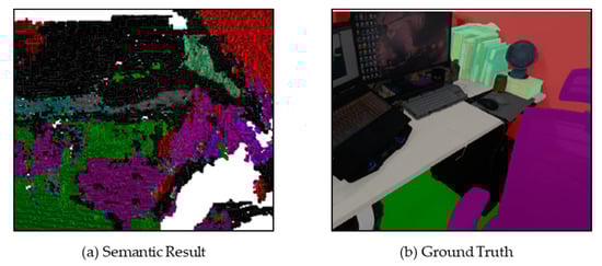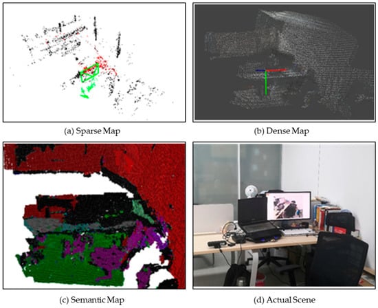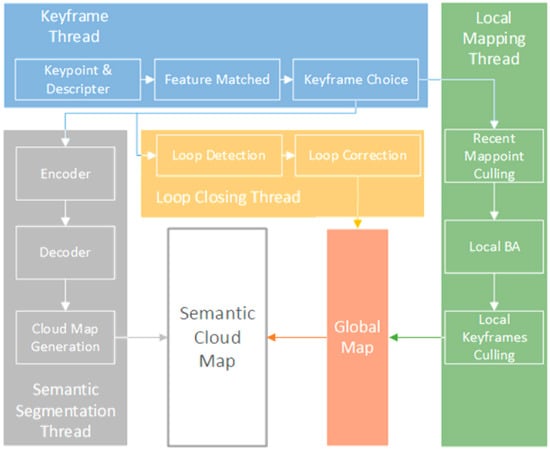 8], has shown significant operating speed, robustness, and localizing accuracy. There are numerous designs in the ORB-SLAM to improve efficiency, which can be executed using a CPU and reach at least 30 FPS. The real-time nature of ORB-SLAM is precisely in line with the real-time requirements of this work. At the same time, it also provides interfaces for monocular, stereo, and RGB-D cameras, which provides the foundation of SLAM construction. However, the final result of the ORB-SLAM has limited readability and practicality, which needs to be processed. We first established a dense global map based on the original ORB-SLAM to ensure that the generated semantic map can match the global map. In addition, we reassigned the threads that SLAM runs and performed further processing during the extraction of keyframes to ensure the efficient operation of the entire program, which are introduced in the next section.