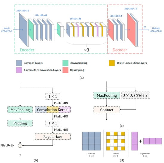 29]) is an efficient pixel-level semantic segmentation network. It uses a 34-layer residual network to form an asymmetric Encoder-Decoder structure. Due to the small number of network layers, the training speed of this network is fast, and the training model is small. To improve the accuracy and ensure the running speed, we have made a simple change of this network, mainly to increase the number of convolution layers but retain the asymmetric structure of the network.