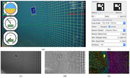 (a) Aruco marker with ID 2 detected by the on-board camera and (b) the on-line parameter configuration of maker recognition process with the (c) grayscale image, (d) binarized image, and (e) polygon extraction stage with marker identification.