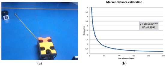 where x is the size reference obtained from the square root of the number of pixels contained in the polygon of the marker detection. We adjust and to obtain a coefficient of determination as close as possible to one () in the exponential fitting using least squares. Figure 3a shows the setup for the distance calibration process. Figure 3b shows the distance calibration using the non-linear interpolation function. We calibrate the uncertainty of distance estimation depending on the slope of the distance calibration interpolation function. We can observe a steeper slope with longer distance estimation.