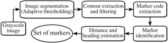 Figure 4 summarizes the flowchart of the procedure for detecting the Aruco markers surrounding the underwater vehicle. The algorithm for detecting the landmarks operates with grayscale images. The first stage consists of the image binarization using an adaptive thresholding technique. We then extract the four-vertices polygons filtering the ones that do not satisfy some geometrical requirements. We detail the filtering criteria and the parameters for their configuration above. We remove the perspective projection of the candidate four-vertices polygons computing the homography matrix. We tessellate the resulting image using a regular grid to match such a resulting image and the reference Aruco markers in the possible orientations. Finally, we use the square area in pixels of the perceived landmark to estimate the distance, whereas we calculate the heading using the position of the detected marker in the image. This processing provides us the set of perceptions from each camera image.