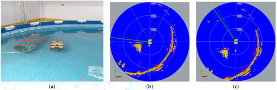 Figure 5a shows the underwater vehicle equipped with a mechanical scanning sonar at the top operating at a circular swimming pool. Figure 5b depicts the spatio-temporal buffer of sonar echoes. The distance estimation readings that lie along the green thick radial line are incorporated into the buffer while the underwater vehicle moves, performing both translations and rotations. The rotation velocity is computed from the heading readings, while we estimate the translation velocity from the inertial and DVL sensors. Echoes with the most amplitude are represented in red, while others in different shades of yellow. We can notice a static object close to the robot, about its left rear part, appears to move in the vehicle-centered coordinate space.