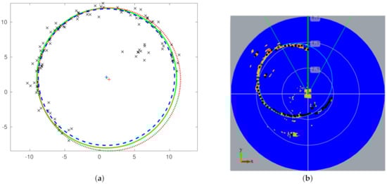 (a) Example of circle-fitting using noisy data, and (b) the fitted circumference using data received from the mechanical scanning sonar in a swimming pool with Algorithm 1.