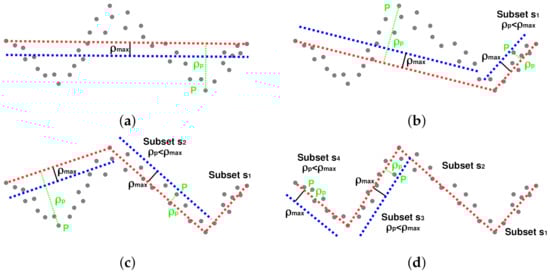 Iterative End Point Fit (IEPF) algorithm: (a) initial splitting process considering k points, (b,c) recursive split, and (d) stopping criterion.