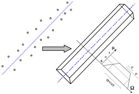 Scatter of points and fuzzy segment representing its uncertainty with a trapezoidal fuzzy set.