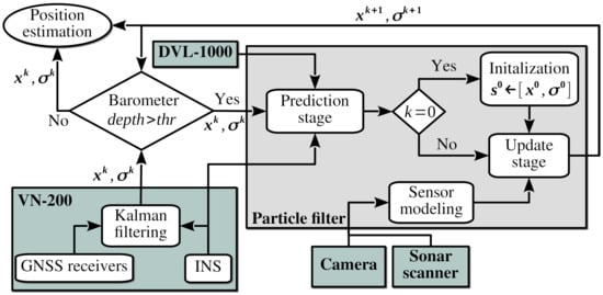 Tracking and localization methods aim to fuse uncertain position measurements to estimate the variable of interest with different assumptions about the representation of the vehicle’s location. The techniques based on variants of the Kalman filter and Sequential Monte Carlo (SMC) method are the most popular tracking and localization methods, respectively. The Kalman filter is a recursive state estimator of a discrete-time controlled process governed by a linear stochastic differential equation. It is the minimum variance state estimator for linear dynamic systems with Gaussian noise and the minimum variance linear state estimator for linear dynamic systems with non-Gaussian noise. We usually use these methods for tracking the vehicle position in underwater scenarios. We can mention the Extended Kalman filter (EKF) [12,13,14] and the unscented Kalman filter (UKF) [9,15]. However, we have to remark that these techniques are suboptimal state estimators for a non-linear system. One of the main advantages of such tracking techniques is that they represent the state and its uncertainty using a Gaussian distribution. This representation facilitates the efficient implementation of the filter with a reduced computational cost. However, they are not able to recover from divergences in the recursive estimation process. The localization approaches based on the SMC method [16,17,18] are robust to uncertain and incoherent information, allowing recovery from divergences in the state estimation process. Nevertheless, they suffer from severe computational requirements. This fact is particularly for large and complex domains, where we require numerous samples to represent complex stochastic distributions of the state-space model.