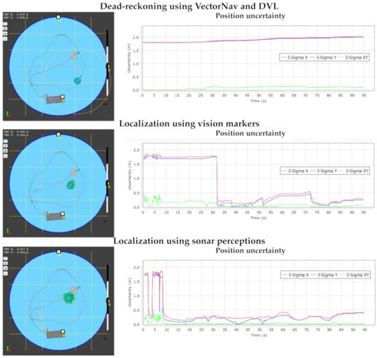 Position estimation uncertainty using (top) dead-reckoning, (middle) vision markers, and (bottom) sonar perceptions in the structured swimming pool scenario.
