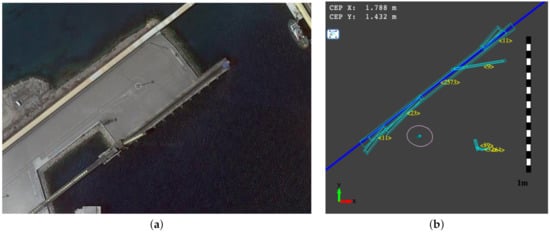The experiments in the harbor dock consist of the submerged navigation of the underwater vehicle performing inspection tasks. In particular, we follow the dock harbor wall to perform such inspection tasks [34]. Figure 14a shows the satellite image of the dock harbor scenario. Figure 14b depicts a representation of the environment around the vehicle using the fuzzy segment representation. We update the belief of the variable of interest using the speed estimates provided by the INS of the Vectornav VN-200 navigation system and the DVL-1000. The vehicle uses the mechanical sonar scanner Ping360 to perceive the walls of the dock harbor. We use the sensor modeling techniques presented above to perceive the features surrounding the vehicle during underwater navigation. We fuse these features with the motion estimation to estimate the vehicle belief and the location uncertainty using the particle filter.