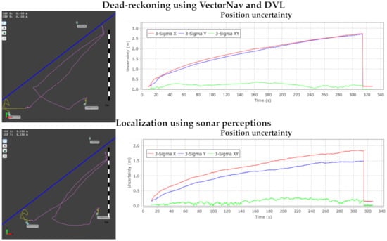 The dead-reckoning experiment only uses the INS of the Vectornav VN-200 navigation system and the DVL-1000 speed estimations. We can observe that the path followed using dead-reckoning approximates the route followed by the underwater vehicle. However, the position error is cumulative or compounding over time using such an approach. Thus, we can observe that the underwater vehicle goes through the pipe in the structured environment because the estimated position degrades over time. We also have noted that the correlation coefficient grows unbounded during the navigation. We only introduce three Aruco markers in the structured environment, which are detected sporadically during the navigation. We represent these Aruco markers using empty squares with the corresponding ID. These sporadic observations allow us to correct the position estimation and the uncertainty of the vehicle belief represented by the correlation coefficient , as shown in Figure 13(middle). However, we can observe that the position estimation compared to the ground-truth is of the order of half a meter. We have to remark that we can enhance the accuracy of position estimation by adding vision markers. The Video S1 in the Supplementary Materials shows the navigation and position estimates using the Aruco markers. Finally, we can observe that the best position estimation is obtained using the features from the sonar scanner observations, in particular the circumference arcs obtained using the circular model fitting presented above. The representation surrounding the vehicle during the underwater navigation allows us to feed the localization approach with coherent information that allows us to track the vehicle with a high degree of accuracy. We can also observe that the estimation of the uncertainty of vehicle location is kept under half a meter during the navigation. This information is coherent with the location estimation provided by the ground-truth.