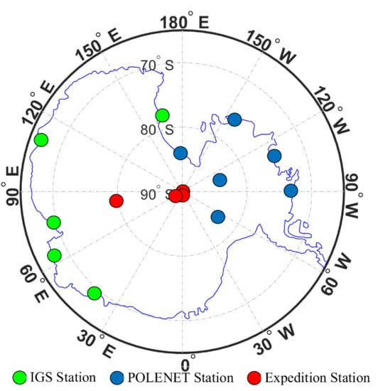 The observational data used in this study were the dual-frequency observational data from GNSS stations in the Antarctic. These stations include five IGS stations, six Polar Earth Observing Network (POLENET) stations, and four GNSS stations built by members of the Antarctic expedition. The distribution of all these stations is shown in Figure 1. The observational data were collected in December 2016, March 2017, June 2017, and September 2017, while the data from four GNSS stations in December 2016 were collected by Antarctic expedition members.