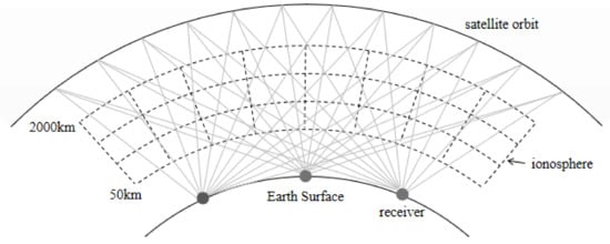 For the IRI-2016 model, the vertical electron density of the top side (top of hmF2) and bottom side (bottom of hmF2) could be calculated using different formulations. The information of vertical electron density is described in Table 1 in detail. The electron density at any point in the ionospheric region can be calculated by interpolation. Then, the obtained electron density can be used to compute STEC values via integration in the GNSS signal propagation path, as shown in Figure 2 and Equation (5).