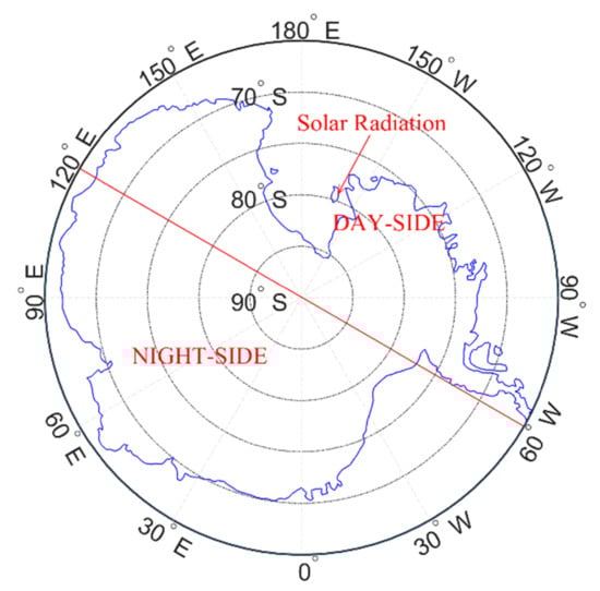 Since the radiation conditions in March and September are basically the same, the Antarctic is divided into day side and night side (at 2:00 UT, the day side contains an area of 120° E to 180° and 60° W to 180° and the night side is 0° to 120° E and 0° to 60° W. At 14:00 Universal Time, the opposite occurs.). Then, both the day side and the night side are divided into six latitude bands with intervals of 5° in latitude, as shown in Figure 3. The bias and root mean square (RMS) values were counted to compare the accuracy of the two models of STEC in different latitude bands with different solar radiation. Similarly, in June and December, the Antarctic was divided into six latitude bands (without day side and night side), and bias and RMS in each band were separately counted.