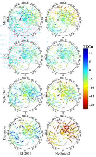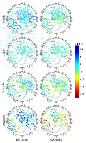 The dSTEC values of the two models with GNSS STEC are shown in Figure 4 and Figure 5, corresponding to 02:00 UT and 14:00 UT in the four experimental months. In these two figures, the projection height is 300 km (i.e., the ionospheric electron density peak height). Based on the analysis of the projection, it is apparent that the IRI-2016 STEC value was higher than the NeQuick2 value and the difference varied with time. In June, the dSTEC of the two models showed little difference. It was basically maintained within 2 TECu, and the two modeling STECs were basically the same. In March and September, the difference for the NeQuick2 model was significantly higher than that of the IRI-2016 model, and the IRI-2016 STEC was approximately 3–10 TECu higher than NeQuick2 STEC, but the difference between the two models was basically consistent in March and September. In December, the difference was further expanded. As shown in Figure 4 and Figure 5, the IRI-2016 STEC in December was about 15–20 TECu higher than NeQuick2 STEC. By comparing the results with COSMIC occultation data, it was concluded, from Figure 6, that at the E, F1, and F2 layers, the IRI-2016 misestimated TEC by about 7.23%, −35.41%, and −9.64% in March, −50.78%, −23.2%, and −0.87% in June, 14.22%, 35.13%, and −3.68% in September, and −17.75%, −4.08%, and −1.13% in December, respectively; NeQuick2 misestimated about 9%, −69.03%, and −8.39% in March, −61.8%, −59.7%, −2.26% in June, −16.35%, −23.35%, and −0.41% in September, and −41.54%, −36.58%, and −10.38% in December, respectively. Considering the dominance of the electron content in the F2 layer, these experimental results indicated that both models underestimated STEC and that the performance of the NeQuick2 model was more obvious. Different from NeQuick2, which relied on the CCIR model for M(3000)F2 and on the close correlation between hmF2 and M(3000)F2, IRI-2016 used AMTB and SDMF2 models to represent hmF2 directly. This effectively avoided the error source connected with the M(3000)F2 approach and explained that the IRI-2016 STEC was closer to GNSS STEC than NeQuick2. In this study, GNSS STEC was calculated up to 20,200 km and contained not only the ionospheric total electron content (ITEC) but also the plasmaspheric total electron content (PTEC) in the plasma layer, but these two models only calculated the STEC from the receiver to a height of 2000 km. Thus, in addition to the limitations of the accuracy of these two models, PTEC in the plasma layer over the ionosphere was also one of the factors that caused the above results. The global distribution of the plasma layer PTEC was analyzed in detail, and the content of PTEC in the Antarctic was approximately 2 TECu [], which is significantly less than the difference obtained in this paper. This indicates that the difference in this study could not be completely caused by PTEC.
