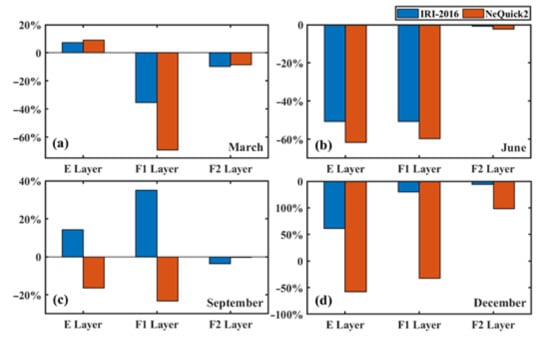 Statistics on the rate of misestimation of models in each ionosphere layers. E, F1, and F2 layers represent the altitude range of 100–140 km, 140–210 km, and 210–800 km, respectively. Figures (a–d) mean statistical results in March, June, September, and December, respectively.