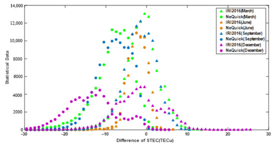 To analyze the deviation between the two models’ STEC and GNSS STEC, the difference in STEC was statistically distributed according to a statistical interval of every 1 TECu, as shown in Figure 7. It is apparent that the dSTECs of the two models generally had normal distributions. For the IRI-2016 model, dSTEC obeyed a normal distribution with a zero axis of symmetry. In the case of the 95% confidence level, the confidence interval of dSTEC in June, March, September, and December were (−8, 3), (−14, 10), (−14, 9), and (−18, 12), respectively. The symmetry axis of NeQuick2 model’s normal distribution curve varied with time, which were −2 TECu, −8 TECu, −8 TECu, and −12 TECu in June, March, September, and December, respectively. At a 95% confidence level, the relevant confidence intervals in June, March, September, and December were (−8, 3), (−25, 2), (−23, 2), and (−30, 3). Since the solar radiation intensity in the Antarctic increased successively in June, March, September, and December, it was concluded that the two modeling STECs were both affected by the intensity of solar radiation. Specifically, as solar radiation increased, both the dSTEC and modeling accuracy of the IRI-2016 model and the NeQuick2 model decreased. In addition, the NeQuick2 STEC was underestimated and systematically biased as solar radiation increased. The performance of the IRI-2016 model was less affected by changes in solar radiation and the dSTEC varied little in different seasons. Thus, the IRI-2016 model was more stable. In contrast, the deviation of the NeQuick2 model fluctuated greatly as seasons changed, and the model was more sensitive to changes in solar illumination, which can be considered in the next generation model update.