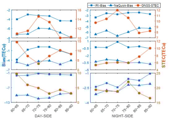 - Bias of both models did not vary greatly with latitude on the night side but decreased and then increased as latitude increased on the day side. This could be because the GNSS STEC in the Antarctic is generally small and gradually decreases as latitude increases, but the modeling accuracy near the pole was poor owing to the lack of observational data. In the intermediate latitude bands (70–80° S) of the Antarctic, the bias value between day and night side was close, with a difference of approximately 0–1.5 TECu. In the lower (60–70 degrees S) and higher latitudes (80–90° S), the bias value on the day side was larger than that on the night side, with a difference of approximately 1–3 TECu. In addition, the variation of the bias value of the NeQuick2 model between different latitudes was more obvious. In conclusion, the modeling accuracy near the pole must be improved, which can be considered in the next versions of the two models.