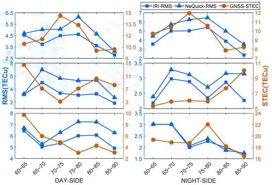 Variation in GNSS STEC and modeling Root Mean Square (RMS) values. Three rows are aligned vertically at both left- and right-hand sides, respectively. Left-hand side represents the statistics of the variation of GNSS STEC and RMS values of the two models with latitude in day side, while right-hand side represents in night side. The first row represents GNSS STEC and RMS variation of two models from 1:00 to 3:00 in March and September. The second row represents STEC and RMS variation of two models from 13:00 to 15:00 in March and September. The third row represents GNSS STEC and RMS variation of two models in June and December. Day side means polar day and night side means polar night.