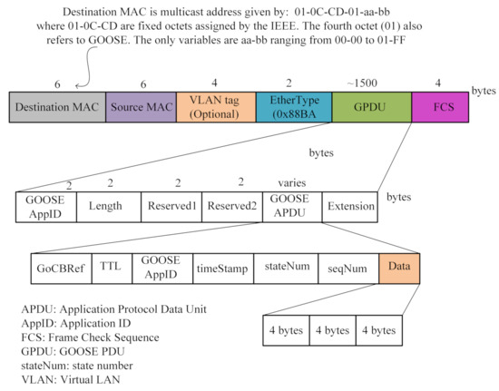 Step 4: After the encoding and data modeling in Step 3, the PubIED generates the GOOSE message. The generated GOOSE data are mapped to the Ethernet data frame, eliminating headers of the other higher layers of the Open Systems Interconnection model. In this paper, the GOOSE data frame structure is analyzed following the definitions of the GOOSE protocol in IEC 61850 Part 8-1 [10,13].