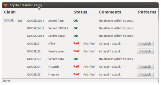 1. A rigorous verification is made of the GOOSE protocol using both automatic and manual security analysis using Scyther. There are various automated security claim verification tools whose detailed reviews can be found in [18,19]. Scyther [18,20] has a number of advantages including its effectiveness for different attack cases, support for multiple protocols, its operational semantics of security protocols, etc. Although other security verification techniques can also be used, in this article, the Scyther tool is utilized where a rigorous security verification of the GOOSE protocol is found using both automatic and manual security analysis. In particular, it is found that the secrecy of the user-defined parameters of the GOOSE protocol, e.g., IED settings, flag, and data, are at risk. Furthermore, the protocol’s data flow is constructed using Scyther’s trace patterns (Section 4 and Section 6).