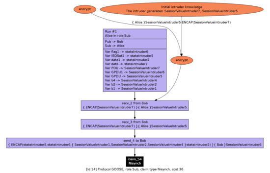 It can be seen from Table 7 that most of the automated and manual claims related to user data have one attack scenario at the publisher’s end as the publisher has the authority to repeatedly send the same message to a group of subscribers in plain text. At the same time, user data are less prone to falsified attack at the subscriber’s end as it only reads data with a standard set of criteria. Furthermore, it is important to note based on our simulation result that all three roles, namely Alive, Weakagree, Nisynch, and Niagree, failed to comply with the four characterization security properties. This is due to the excessive trace patterns that can be used by inside attackers to exploit all roles involved in the GOOSE message communication. This can further be confirmed by the result in Figure 8. One of such attacks, presented in Figure 9, illustrates that an intruder Alice masquerading as a Sub (Subscriber) can use header information by taking advantage of the publisher’s re-transmissions and thereby fool legitimate subscribers to accept malicious and that have been prepared using the attacker’s user-defined values.