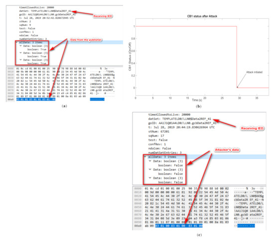 (a) GOOSE message captured before attack, (b) change in CB1 status and (c) GOOSE message captured after attack.