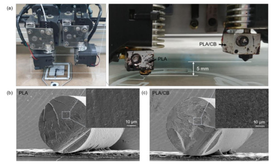 (a) Homemade fused deposition modeling (FDM) 3D printer (left) equipped with a dual nozzle extruder (right) injecting polylactic acid (PLA) and PLA/carbon black (CB) filaments; cross-sectional scanning electron micrographs of the (b) PLA; and (c) PLA/CB filaments.