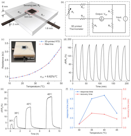 (a) Schematic of the proposed planar-type resistance temperature detector (P-RTD) and its dimension for 3D printing; (b) equivalent circuit of the P-RTD (dashed box on the left) and the Wheatstone bridge (dashed box on the right); (c) resistance change of the P-RTD with the applied temperature, along with the fitted line with a temperature coefficient of resistance (TCR) of 6.62 %/°C; (d) stable operation of the P-RTD during the temperature change cycle; (e) resistance change in the RTD over time when increasing the temperature from 30 to 45 °C with 5 °C intervals; (f) response and recovery time of the P-RTD.