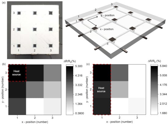 Figure 4a shows the optical image of this P-RTD array and its CAD drawing for the 3D printing. The geometry and material of each P-RTD in the array were the same as those of the single P-RTD presented in Figure 3. The location of the applied heat source was identified through embedding horizontal and vertical bit lines; this time, the temperature magnitude could be derived from the change in the resistance of the sensing pad, measured by the two bit lines.