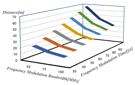Figure 2 shows the maximum detectable distance () calculated according to the transmit power and the noise figure using Equations (1)–(3) for FMCW mode [15]. In Figure 2, the x-axis represents the noise figure, the y-axis represents the transmit power, and the z-axis represents the distance. It can be seen that as the transmit power increases and the noise figure decreases, the detectable distance increases. More calculated results for maximum detectable distance are tabulated as shown in Figure 2. When the maximum detection distance in FMCW mode is calculated using the noise figure of 12.9 dB and the transmission power of 13 dBm obtained earlier, a detection distance of 84.4 m can be obtained.