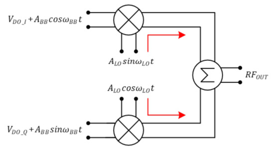 Figure 6 shows the principle that LO leakage occurs in a direct conversion transmitter. A signal including DC offset enters into the I/Q phase and is mixed with the LO signal, going to the . can be expressed as shown in Equation (7).