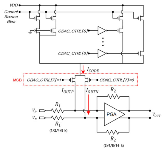 Figure 7 shows the circuit diagram for CDAC where the current can be sequentially adjusted by multiples of 300 nA from LSB to MSB. Current can be adjusted up to 19.2 A, and the input values of the P and N nodes are reversed through the MSB. For example, if 1 is set to MSB, the PMOS of the P node is turned off and the PMOS of the N node is turned on.