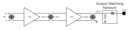 As the PA must supply a high power to the antenna, the power gain is compensated additively through the DA. Therefore, inter-stage matching between DA and PA is also required, and the DA output and the PA input are matched using a transformer [19,20].