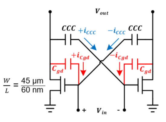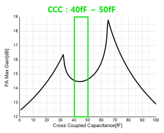 Because PA consumes a lot of current, the transistor size becomes very large, and as the transistor size increases, the parasitic capacitance also increases. In particular, as a leakage current is generated by the parasitic capacitor between the drain and the gate, and the gain and efficiency of the power amplifier decrease. Therefore, it is designed to cancel the leakage current by applying a cross-coupled capacitor (CCC) as shown in Figure 9. If and are the same, the leakage current is canceled effectively.
