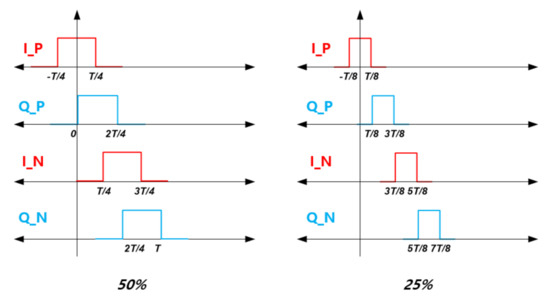 When the mixer adopts a 25% duty cycle for LO injection, a waveform for the positive I phase () having a duty of [−T/8, T/8] in Figure 15 can be expressed by Equation (9) where means the duty ratio. Therefore, one can find , , and .
