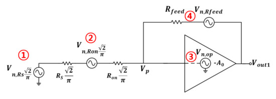 In the meantime, for mixer’s noise analysis, as shown in Figure 16, it can be expressed as an equivalent model. Internal resistance is expressed as a resistance of at each input node in consideration of differential input, and noise generated by OP AMP is expressed as as an input referred noise source. The noise source at each resistance is expressed in voltage, the switching operation occurs in the mixer, and the RF signal is converted into an IF signal.