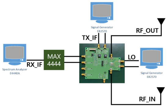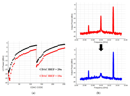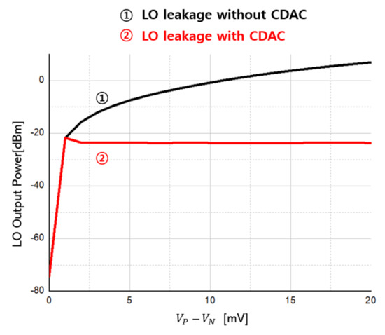 If DAC is connected to the P and N nodes of the PGA, respectively, and the current according to the 8-bit CODE is supplied to the P node and the current comes out of the N node, a DC voltage is obtained by the product of the equivalent resistance of the PGA and the current according to the CODE of the DAC as in Equation (8). The voltage as much as the offset can be generated, and DC offset is removed. Through SPI, we adjust the CODE of 8 bits, check the LO leakage on the spectrum analyzer, and adjust the CODE in the direction that LO leakage decreases.